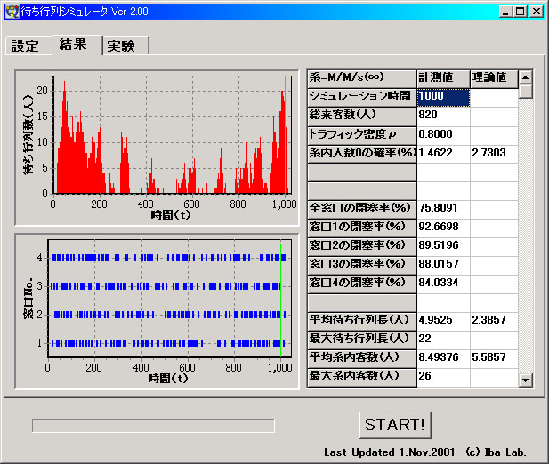 ・トラフィック密度ρに関するパラメータを変化させて、フォーカスを他に移すか、「トラフィック密度」のボタンを押すとρが計算されます。ρ>1になると、確率的には客がたまる一方です。その状態でシミュレートする場合は、「ρ>1でも・・・」にチェックをいれます。
