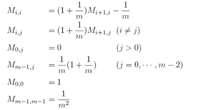 文献2 では、すべてのカードは1 からm の値を等しい確率で取ることを仮定したときの 確率推移行列Mが以下のように与えられることから理論値を求めている。